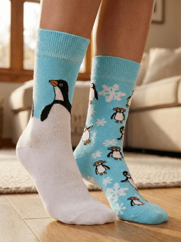 Kutupların En Sevimli Misafiri Pengi Ayaklarınızda! Kışın soğuk günlerine inat, içinizi ısıtacak bir tasarımla tanışın! Sağlı Sollu Pengi Desenli Soket Çorap, buzulların neşeli maskotu penguenlerden ilham alınarak tasarlanmıştır. Sıradan desenlerden sıkılanlar için üretilen bu model, asimetrik (sağlı-sollu farklı) yapısıyla fark yaratır; bir çorapta buzda kayan oyuncu bir Pengi, diğerinde ise size bakan şaşkın bir Pengi figürü adımlarınıza eşlik eder. Gri, siyah ve buz mavisi tonlarının hakim olduğu bu tasarım, hem jean pantolonlarla hem de ev giyiminde pijama altlarıyla mükemmel uyum sağlar. Penguen desenli çorap, hayvan figürlü soket çorap veya sevdiklerinize alabileceğiniz eğlenceli hediye çorap arayışındaysanız, bu model tam size göre.