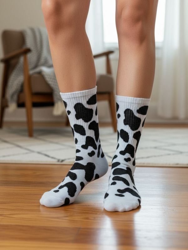 Siyah Benekli İnek Tasarım Spor Tenis Çorapları, son dönem trendlerinin vazgeçilmezi olan sevimli inek desenini, klasik tenis çorabı formuyla birleştiriyor. Bu çoraplar, giyim tarzına eğlenceli, sıra dışı ve modaya uygun bir dokunuş katmak isteyenler için mükemmel bir seçimdir. Yüksek ve lastikli (Tenis Çorap modeli) yapısı, ayakkabı içinde sabitlik sunarken bileği güvenle kavrar. İster spor yaparken ister günlük kombinlerinizle kullanın, bu desenli çoraplar tarzınızı öne çıkarır. Bu ürün, özellikle inek desenli çorap, cow print çorap, benekli spor çorap veya hayvan desenli uzun çorap arayan, neşeli ve güncel trendleri takip eden kullanıcılar için gözde bir parçadır.